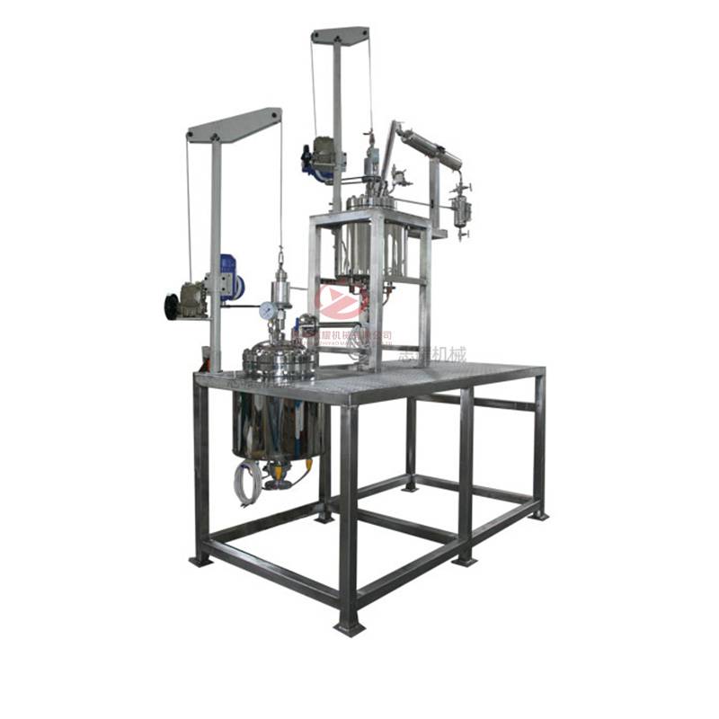 蒸馏反应釜的成份介绍:在水壶壳的上方,蒸馏釜壳上方是上部喷头,上部喷头上有出气口,在上部喷头下方有除沫器,消泡剂下方是储藏室。储藏室的上部设有进料口,储藏室中设有蒸发器。蒸馏釜的下部是固体高沸点沉淀室。搅拌器安装在沉淀室中。搅拌器轴通过轴封连通到外部马达。设立固体和高沸点排出口,优点是可以随时排出固体和高沸点物质,而不必间歇性维护和干净,保证连续生产